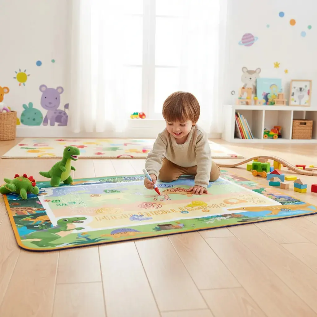 Dibujar en el avión sin manchas, sin tinta, sin regaños. El Tapete de Agua Mágico de 100 x 80 cm es uno de esos juguetes de viaje que no ocupan espacio porque se pliega completamente, pero que despliegan horas de entretenimiento. El mecanismo es tan simple como genial: llena el rotulador con agua limpia, dibuja en el tapete y en minutos el dibujo desaparece solo, listo para empezar de nuevo. Una y otra vez, sin fin.